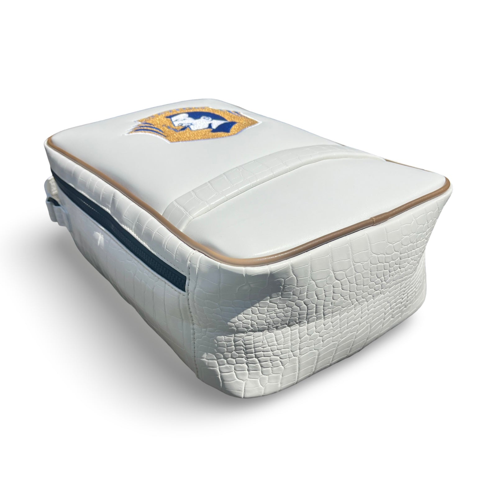 The Locker Room Tote has durable marine vinyl outer layers with faux-croc accents to keep your valuables secure wherever you go. Weather resistant abs zippers ensure reliable closure every time. Inner-lined with a padded nylon, this bag certainly checks every box. Top it off with a bold Smoking Tom needle point embroidery to let everyone know you’re not only a player with discerning taste, you’re a Nation Man.